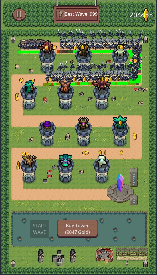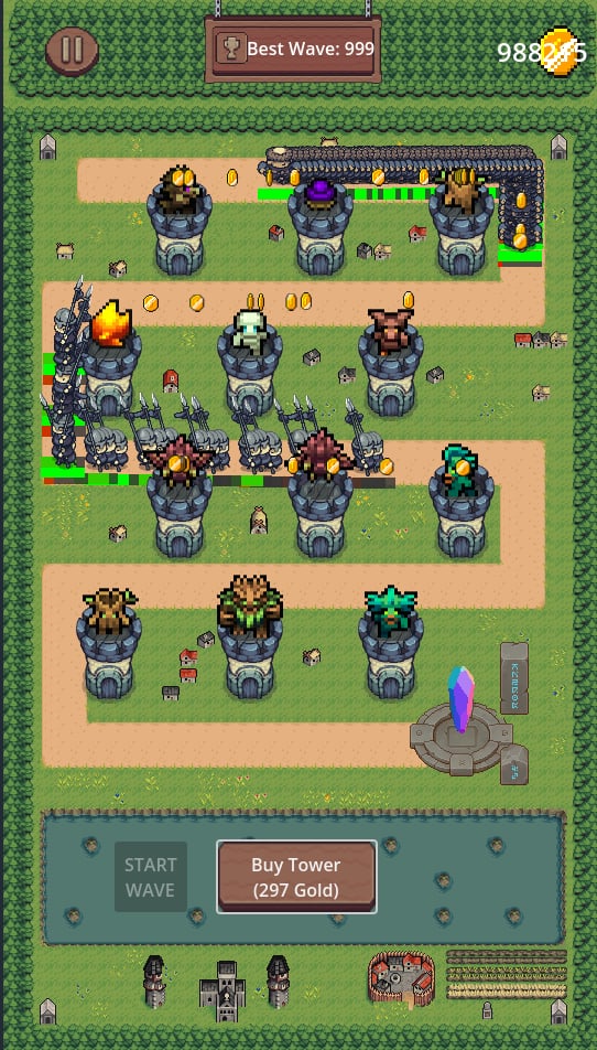 Starting: Press “Start Wave” to begin. Enemies follow the path toward your Heart Crystal. You start with 20 Gold to spend.